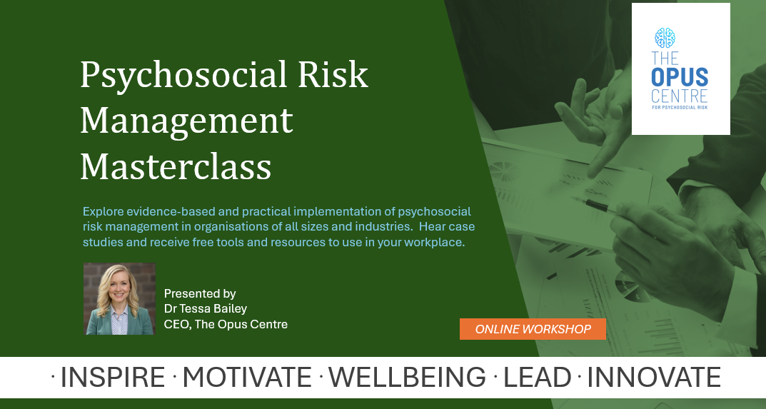 This Masterclass led by leading psychosocial pracademic Dr Tessa Bailey, explores the practical implementation of psychosocial risk management in organisations of all sizes and industries. Hear about key research and case studies that will help you solidify a psychosocial risk management plan for your own workplace. Hear about best practice workplace resources and successes of other organisations.